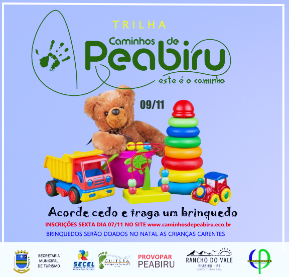 ✅ A confirmação da inscrição da Trilha Pelos Caminhos de Peabiru do dia 09 de novembro será 01 (um) brinquedo simples.